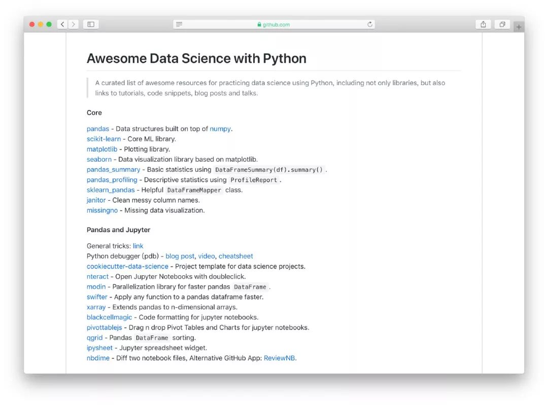 一份由维也纳数据科学家 Florian Rohrer 整理的 Python 数据科学清单,含各种工具、代码片段、教程、博客等资源。