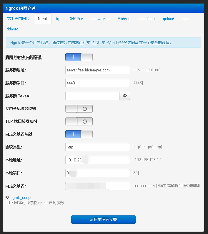 打开花生壳内网版设置->Ngrok内网穿透,启用Ngrok内网穿透