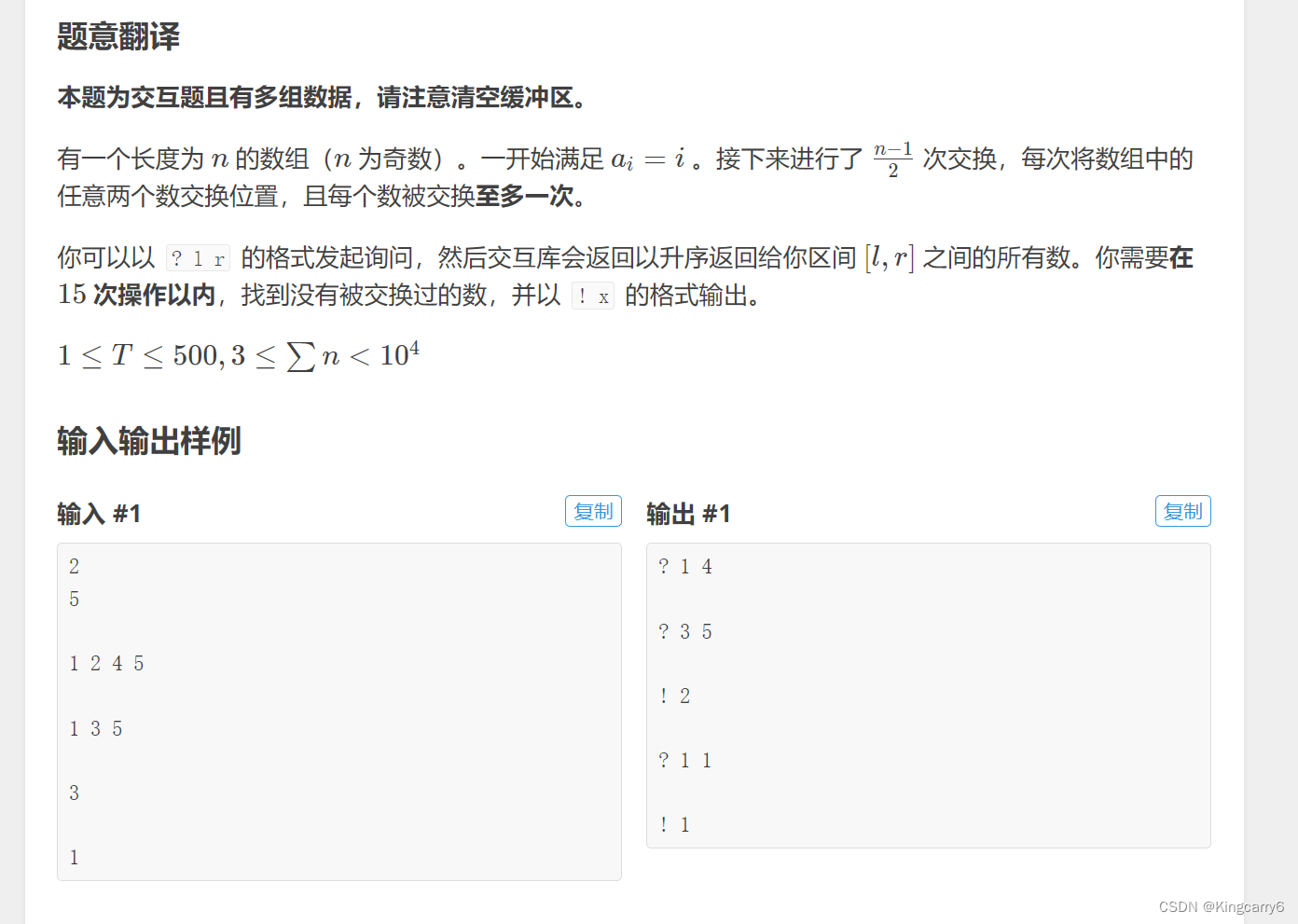 {cin >> n;int l=1,r=n;// 因为n为 奇数// 如果 下标[l,mid] 的数都被 交换过,那么在这个区间里 值为[l,mid]的 数的个数 为偶数个0~2*x//0: 全部与 区间外的数交换,2:有一对交换的 数在区间内 。。。// 如果 值在 这段区间的 个数为奇数,那么那个剩余的数 可以与区间外的数交换 来让这个数的值不在这个区间,// 但是这个数却留在了这个区间,说明这个数 就是我们要的 那个数 while(l < r ){int mid = (l + r ) /2 ;cout<<"? "<> x;if(x >= l && x <= mid ) cnt++ ;//当前读入的 这个 数在这个区间}// 考虑 极端情况 如果 这一段区间的数if(cnt & 1 ) r =mid; // 要找的数 在 左区间else l =mid + 1;}cout << "! " << l <>T;while(T -- ){solve();}return 0;