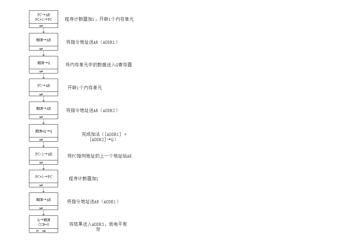 根据指令的功能和指令格式,先读取地址ADDR1单元内容暂时放置于Q寄存器中,然后把PC指向的地址给AR,然后再读取地址ADDR2单元内容,同时与Q寄存器内容相加,结果也暂存放在Q寄存器中,此时进行PC-1→AR操作,将PC指向地址的上一个地址给AR,此时由于地址寄存器AR中存放的是地址ADDR2,因此只要将Q寄存器内容写入存储器就可以完成指令功能。此外,微程序中必须实现两次PC+1→PC操作,才能确保PC的正确走向。