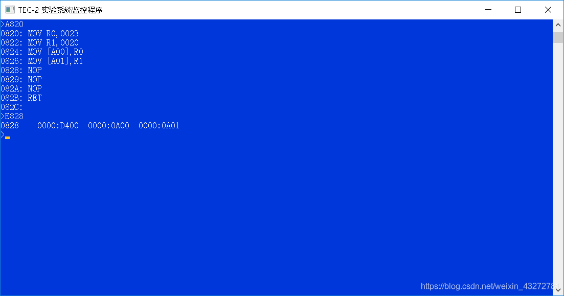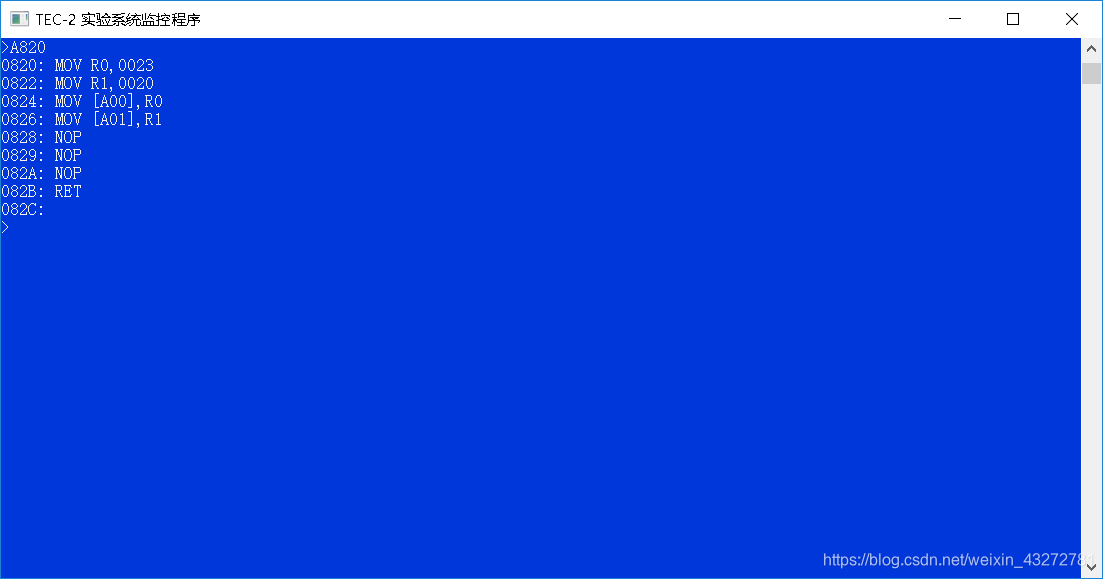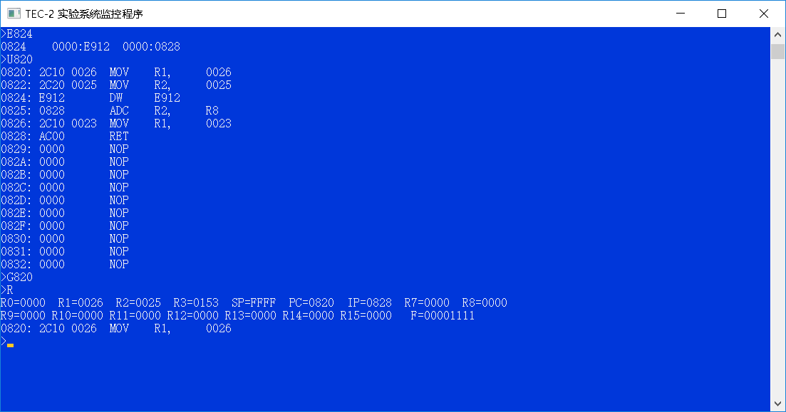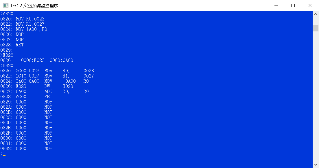 0824: MOV [A00],R0;将寄存器R0中数据赋值给内存单元0A00