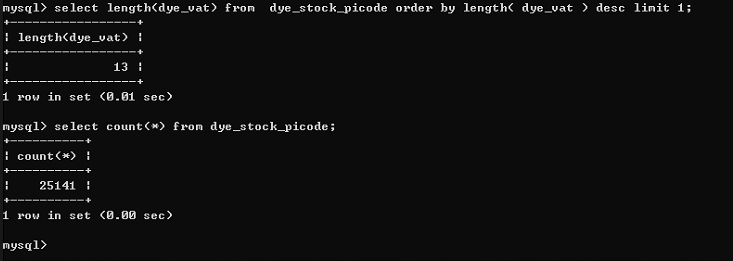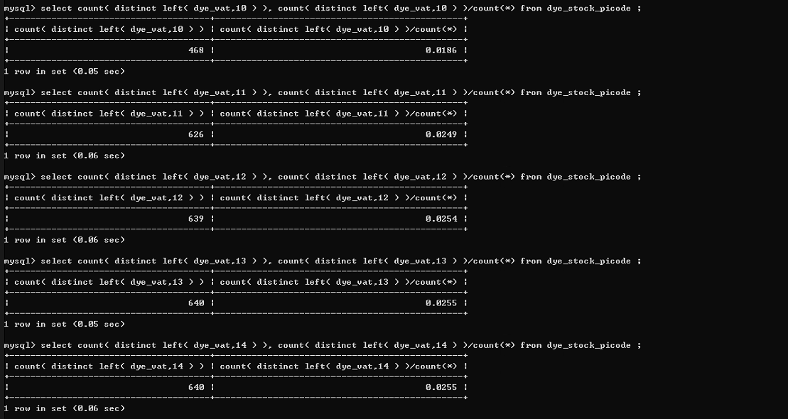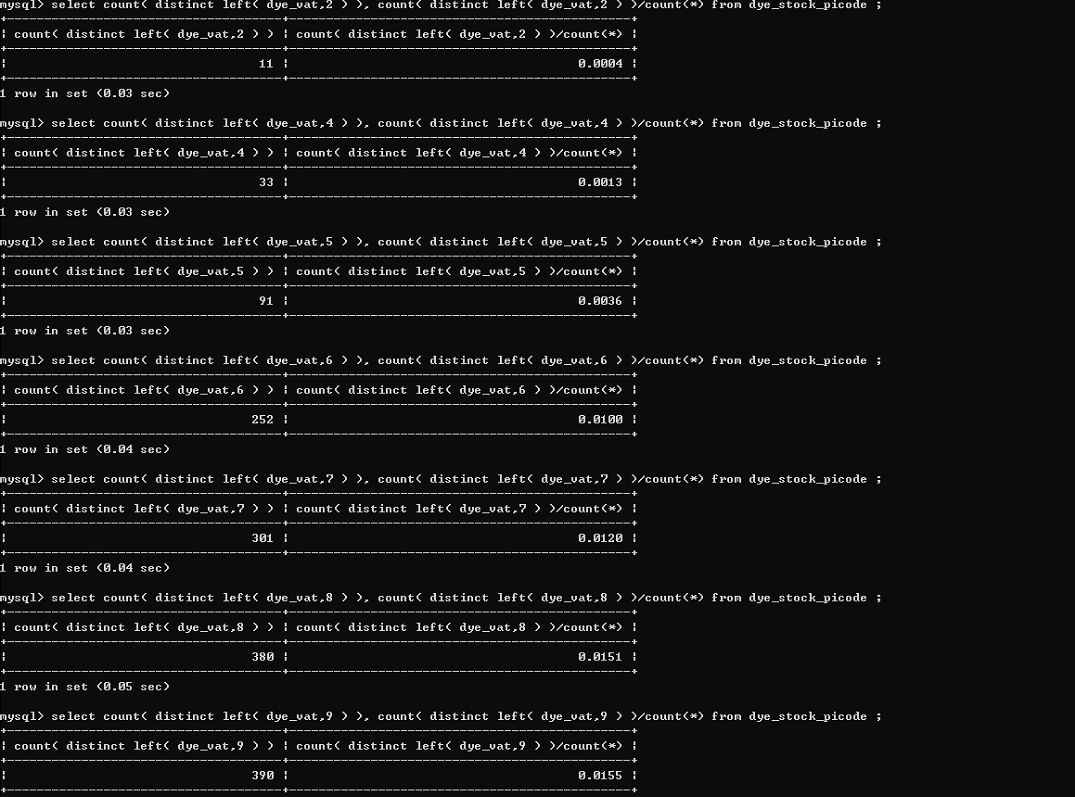 可以看到在这个25141条记录的表中,当字符长度为13时,区分度是最高的,但是后面也看到了,现有表dye_vat 这个字段最大长度也才13,所以我们建立索引的时候不可能以13字符长度建立索引( 就目前来看不太合理) 。