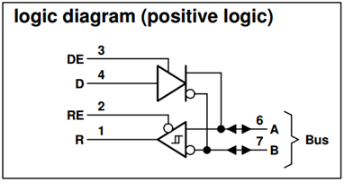 对应到实际芯片框图上就是下面这样(DE发送使能,D是发送数据端,RE是接收使能,R是接收数据端):