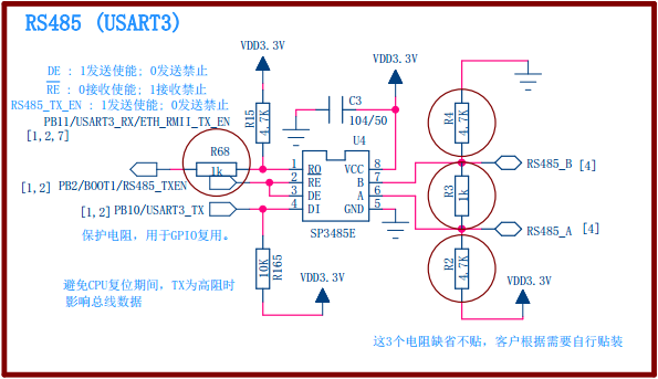 - 由于 485的RO是输出引脚,如果软件上将PB2配置为输出就会冲突(PB2输出高,RO输出低就会短路)。加电阻的话,PB2就可以做其他用途。主要是开发板才这样弄,正式产品不加。