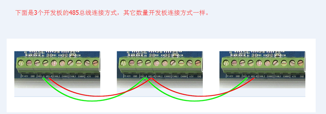 - 开发板的485-A端子连接到一起,485-B端子连接到一起,具体连接看工程Doc文件夹中的截图。