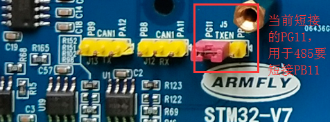 - RS485 PHY的发送使能用的引脚PB11,测试前需要将板子J5处的跳线帽短接到PB11端。