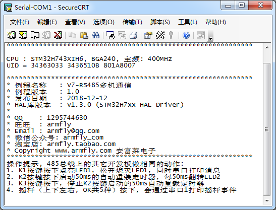 - 按下开发板上的摇杆(上下左右,OK共5种),会通过串口1打印摇杆事件。485总线上的其它开发板做相同的动作。