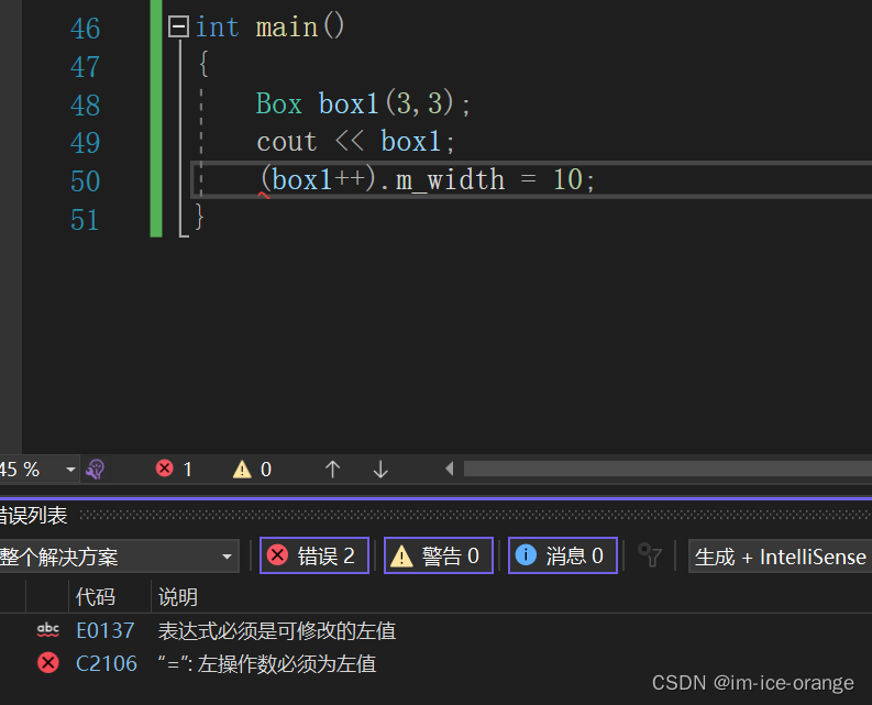 其实我也不知道为什么这里的第一行不会报错,因为经过我的测试,box1++返回的是拷贝构造的一个对象,而这个对象是不能当左值的,因为你的拷贝对象在函数中是局部变量已经没了。因此你是不能被修改的