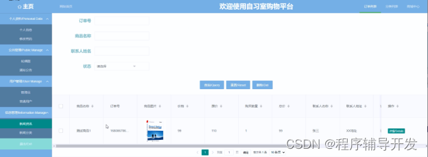 自习室购物平台中的管理人员是可以对自习室购物平台内的资讯信息进行维护和管理的。订单列表界面如下图4-9所示。