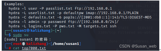 4. 打开hydra, 思路是用kali里的hydra进行爆破,将两个密码字典和用户名字典放到kali的文件夹中,并用cat写入,如下