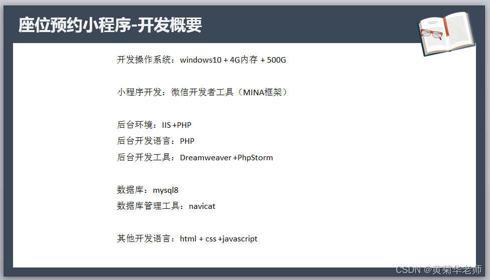后台开发PHP技术;MySQL数据库;以及常规的网页技术HTML/CSS/JAVASCRIPT的介绍。