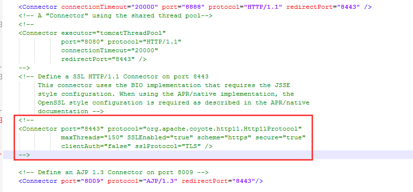 打开server.xml,找到如下代码,去掉注释