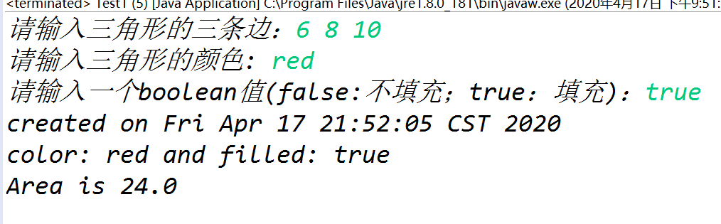 package p11;import java.util.Scanner;public class Test1 {public static void main(String[] args) {Scanner input=new Scanner(System.in);System.out.print("请输入三角形的三条边:");double s1=input.nextInt();double s2=input.nextInt();double s3=input.nextInt();System.out.print("请输入三角形的颜色: ");String c1=input.next();System.out.print("请输入一个boolean值(false:不填充;true:填充):"); boolean f1=input.nextBoolean();input.close();//创建对象GeometricObject object=new Triangle(s1, s2, s3, c1, f1);System.out.println(object.toString());}}
