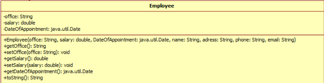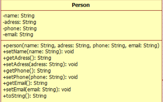 package p11;public class Person {private String name;private String adress;private String phone;private String email;public Person(String name, String adress, String phone, String email) {this.name=name;this.adress=adress;this.phone=phone;this.email=email;}public Person(String name) {this.name=name;}public String getAdress() {return adress;}public void setAdress(String adress) {this.adress=adress;}public String getPhone() {return phone;}public void setPhone(String phone) {this.phone=phone;}public String getEmail() {return email;}public void setEmail(String email) {this.email=email;}public String toString() {return "The Person's name is "+name+"\nAdress is "+adress+"\nPhone is "+phone+"\nEmail is "+email;}
