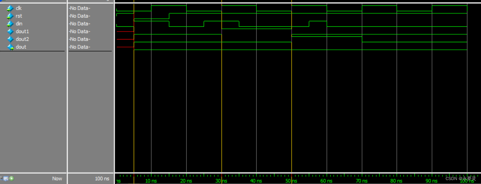 module trace_tb();reg clk;reg rst;reg din;wire dout;initial beginclk=1'b0;rst=1'b1;#5 rst=1'b0;#10 rst=1'b1;endinitial begindin=1'b0;#5 din=1'b1;#10 din=1'b0;#10 din=1'b1;#10 din=1'b0;#20 din=1'b1;#5 din=1'b0;endalways #10 clk = ~clk;trace u1(clk,rst,din,dout);