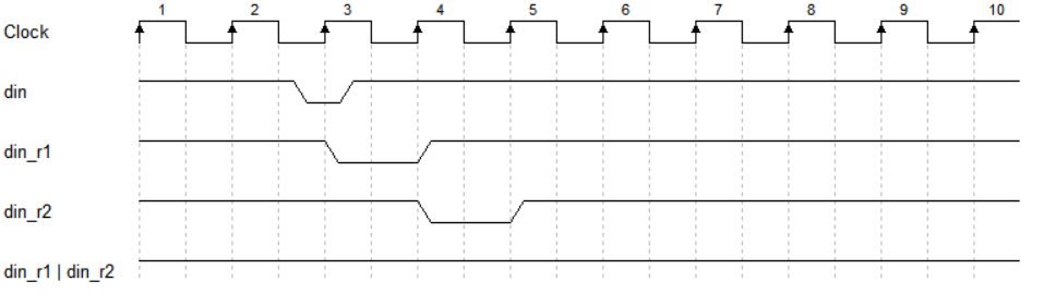 );reg dout1,dout2;always @ (posedge clk or negedge rst) beginif(!rst) begindout1 <= 1'b0;dout2 <= 1'b0;end else begindout1 <= din;dout2 <= dout1;endendassign dout = dout1&dout2;endmodule