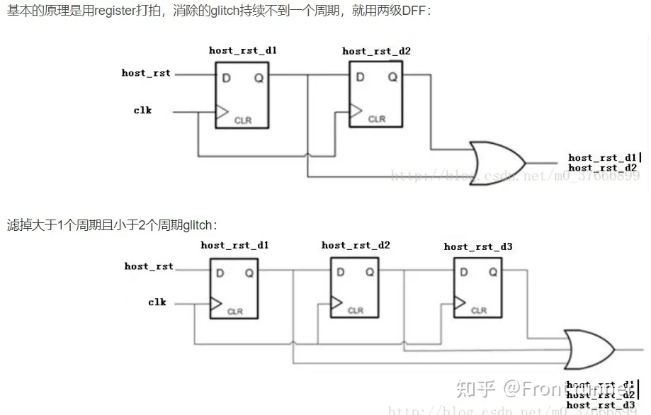 过滤负毛刺,主要用于过滤低电平复位毛刺,不足一个时钟周期的情况下通过打两拍,即两级D触发器,将每一级触发器的结果相或即可,若过滤大于1个周期,小于2个周期的毛刺,就打三拍,以此类推。电路图如下所示: