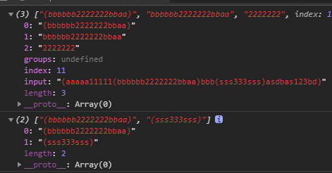 第一个结果是非全局匹配的,可以看到数组中原有三个数据,而这三个数据对应着正则表达式的三层分组:第一层是 \(([a-z]*([\d]*)[a-z]*)\) ,第二层是 ([a-z]*([\d]*)[a-z]*) ,第三层是 ([\d]*) 。(不清楚正则表达式分组的童鞋请自行了解,或查看参考链接。)