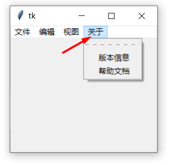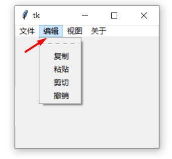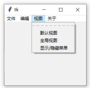from tkinterimport *wnd = Tk()menuBar = Menu(wnd)fMenu = Menu(menuBar)for item in ["新建", "打开", "保存", "另存为", "退出"]:fMenu.add_command(label=item)eMenu = Menu(menuBar)for item in ["复制", "粘贴", "剪切", "撤销"]:eMenu.add_command(label=item)vMenu = Menu(menuBar)for item in ["默认视图", "全局视图", "显示/隐藏菜单"]:vMenu.add_command(label=item)aMenu = Menu(menuBar)for item in ["版本信息", "帮助文档"]:aMenu.add_command(label=item)menuBar.add_cascade(label="文件", menu=fMenu)menuBar.add_cascade(label="编辑", menu=eMenu)menuBar.add_cascade(label="视图", menu=vMenu)menuBar.add_cascade(label="关于", menu=aMenu)wnd["menu"] = menuBar