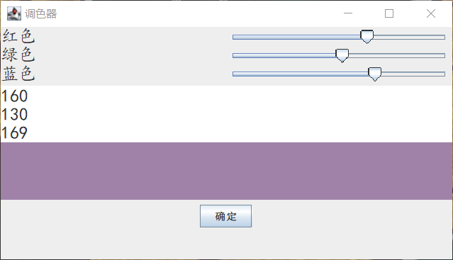 //设置一个面板,存放滑块JPanel jp_slide = new JPanel(new GridLayout(3,2));add(jp_slide);//设置另一个面板,存放显示色号的控件JPanel jp_color = new JPanel(new GridLayout(3,1));add(jp_color);//设置按钮面板JPanel button=new JPanel();js_red = new JSlider(0,255,0); //设置红色滑块js_green = new JSlider(0,255,0); //设置绿色滑块js_blue = new JSlider(0,255,0); //设置蓝色滑块public void stateChanged(ChangeEvent e) {// TODO Auto-generated method stubr = js_red.getValue(); //获取到红色滑块的RGB值g = js_green.getValue(); //获取到绿色滑块的RGB值b = js_blue.getValue(); //获取到蓝色滑块的RGB值//将三种颜色的RGB值在窗体进行显示jt_red.setText(Integer.toString(r));jt_green.setText(Integer.toString(g));jt_blue.setText(Integer.toString(b));//将对应的颜色进行显示colorLB.setBackground(new Color(r, g, b));}
