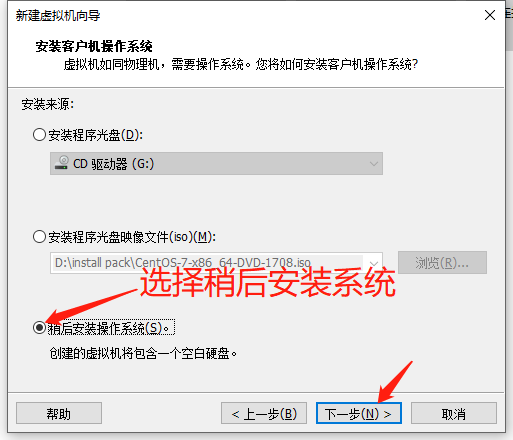 4.在选择安装来源时,选择稍后安装操作系统,然后点击下一步
