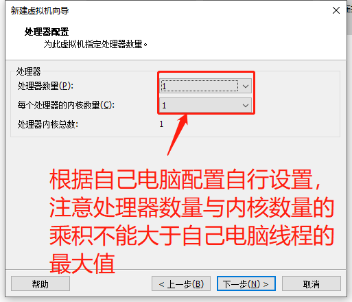 7.选择处理器数量和处理器内核数量,根据自己的需求和电脑配置选择。