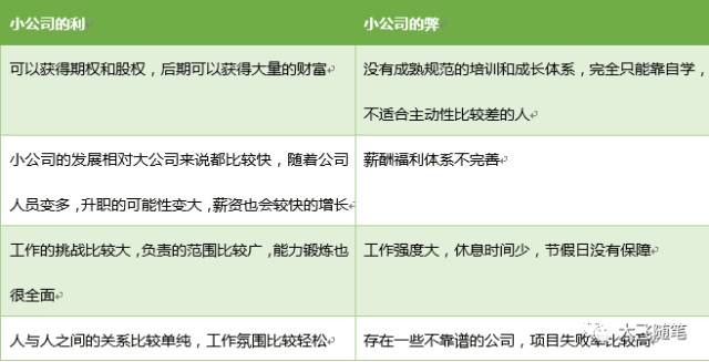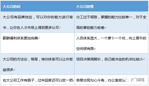 为什么这个问题要放在第一个说呢?因为公司的大小不同,工作的环境也就不同,这决定了两个不同的思考逻辑。以下是我梳理的大公司和小公司的利弊: