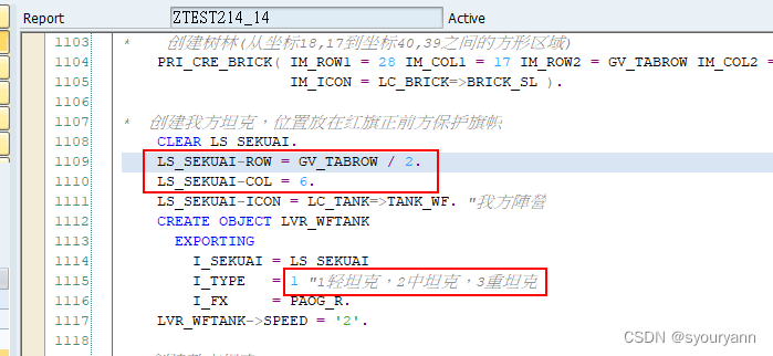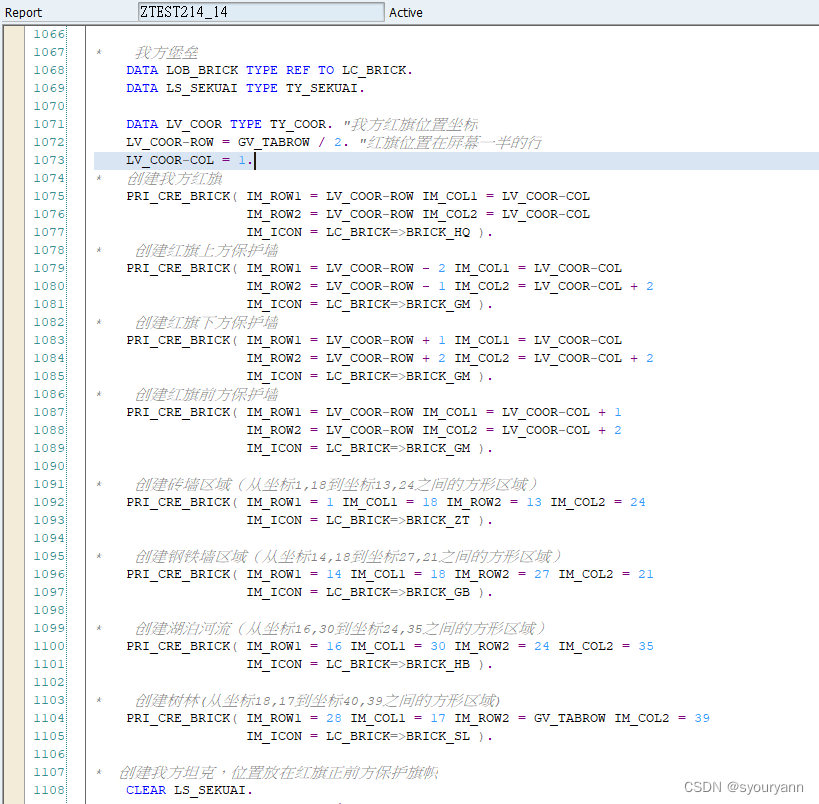 * ).* 我方堡垒DATA LOB_BRICK TYPE REF TO LC_BRICK.DATA LS_SEKUAI TYPE TY_SEKUAI.DATA LV_COOR TYPE TY_COOR. "我方红旗位置坐标LV_COOR-ROW = GV_TABROW / 2. "红旗位置在屏幕一半的行LV_COOR-COL = 1.