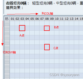 下图是可以自己设置游戏场景的墙体部分的位置,大家也可以自己去开发新的对战场景,如下图确定每個点的坐标,A点在2行3列则坐标是(2,3),同理可以确定B点坐标(2,8),C点坐标(6,8)