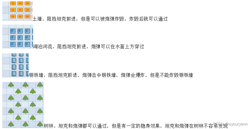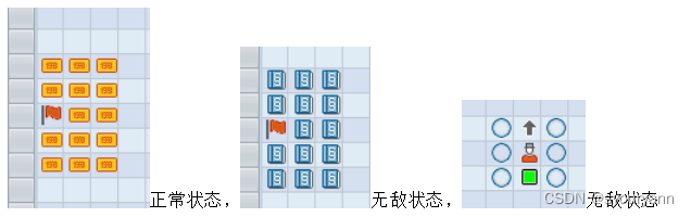 我方坦克,箭头方向是炮管指向,后面的绿色模块表示坦克等级是一,后期可以通过消灭敌人将等级提高。每消灭如下是坦克类型,从左到右分别是我方一级坦克,敌方一级坦克,敌方二级坦克,敌方三级坦克。坦克上的箭头方向就是炮管的方向。区分坦克等级就靠人或日本国旗后面的色块,坦克杀死对方轻型坦克会升一级,杀死对方中坦克就升两级,杀死对方重型坦克就升三级。被对方坦克击中就会降一级,注意升级是需要杀死一辆,如果你击中了一辆敌方重型坦克,敌方重坦会变成中坦,但是你还不能升级,因为你没杀死对方。所以在这个游戏机制下,优先去击毁对方轻坦克,把自己等级升上三级重坦克,再考虑去击毁中坦克或重坦克,三级重坦克不仅有三条命,而且火炮也更强大。