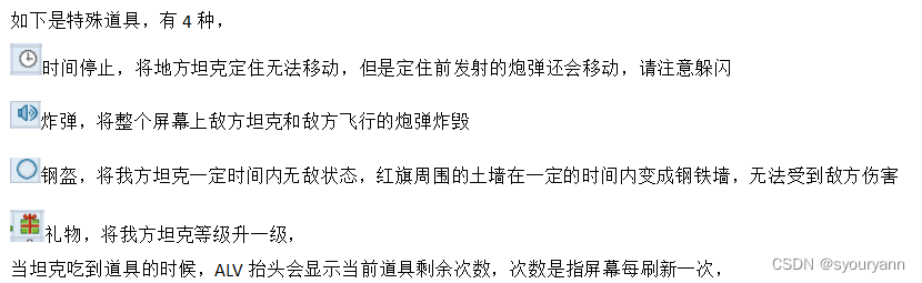 如下是特殊道具,有4种,注意炸弹道具可以炸毁敌方飞行的炮弹,如果自己在炮弹的爆炸范围,会被炸伤。炸弹道具炸毁敌方坦克不算在自己的战绩,因为不是自己击毁的所以自己不能因此升级