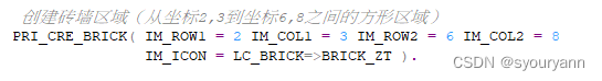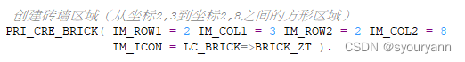 * 创建红旗下方保护墙PRI_CRE_BRICK( IM_ROW1 = LV_COOR-ROW + 1 IM_COL1 = LV_COOR-COLIM_ROW2 = LV_COOR-ROW + 2 IM_COL2 = LV_COOR-COL + 2IM_ICON = LC_BRICK=>BRICK_GM ).