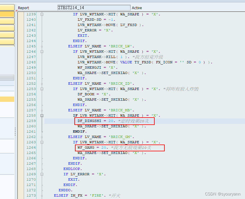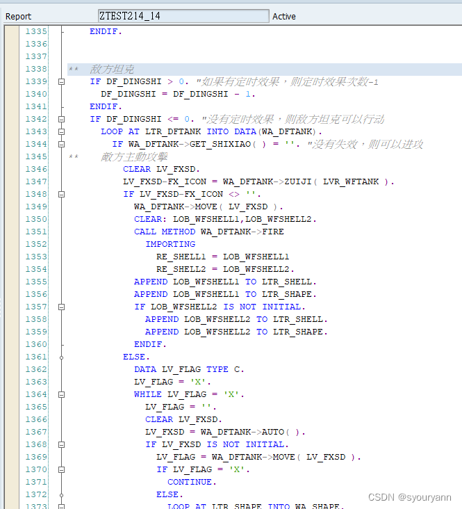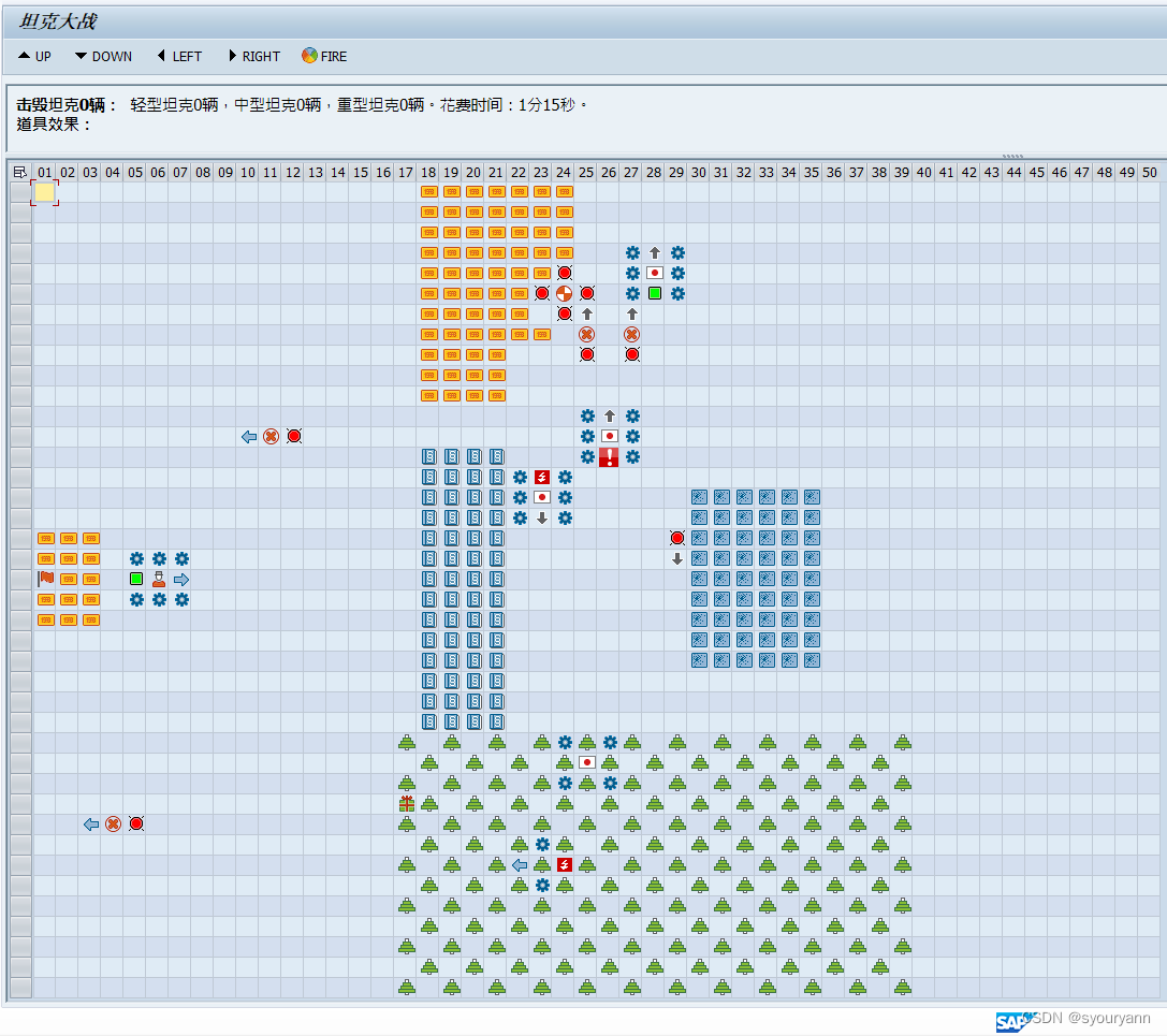 想起小时候买的5块钱折叠小游戏机,里面有贪吃蛇,俄罗斯方块,还有一个我们最喜欢的坦克大战,驾驶我方坦克保卫我方司令部,消灭敌方坦克,至于为什么敌方坦克是日本国旗,那是因为游戏背景发生在抗日战争时期└(^o^)┘。我自己尝试用ALV报表去做坦克大战,因为只能工作间隙的时间的去开发,所以开发时间比较长,而且我的初衷不是为了开发游戏,而是通过开发游戏加深理解OO编程思想,在游戏代码,能尽量用OO的都用OO,开发的中间自己还去查询相关技术文档,经过这次开发,我理解到OO确实好用,但是强行使用的话,也会使开发者感觉碍手碍脚。SAP已经把报表开发流程做的非常完善,经典的流程开发模式就已经足够好了,在工作中要适当选择合适自己的开发思路,同时也要为后续的运维同事提供便利性,不能强行在报表中使用OO增加难度。在文章的最后我会贴上代码供大家参考,直接复制粘贴到SE38就可以激活运行了。代码对于有学习过OO思想的人还是很好理解的,如果没有学习过可能看得就比较吃力了,欢迎大家关注留言讨论,如果很多人留言有不理解的地方,我会在下一遍文章讲解代码逻辑。如果在游戏中发现BUG欢迎提出来,我再修改,毕竟我只是做了简单测试,代码也不是很多,只有1889行。