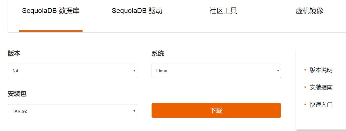 因为虚拟机用 Host-Only 模式,不能连到互联网,因此先去 巨杉数据库 官网下载 http://download.sequoiadb.com/cn/ 安装包