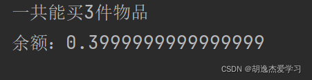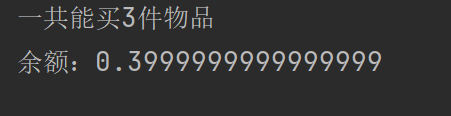 //所有金额BigDecimal funds = new BigDecimal(1);//购买次数int itemsBought = 0;//初次购买是0.1,后续每次购买都会涨价0.1for (BigDecimal price = new BigDecimal("0.1"); funds.compareTo(price) >= 0;price = price.add(new BigDecimal("0.1"))) {funds =funds.subtract(price);itemsBought++;}System.out.println(String.format("一共能买%d件物品", itemsBought));System.out.println("余额:" + funds);}