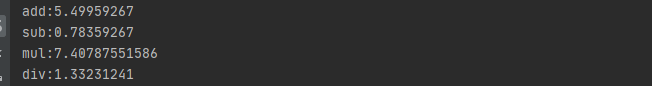 public static void main(String[] args) {String doubleValA = "3.14159267";String doubleValB = "2.358";System.out.println("add:" + add(doubleValA, doubleValB));System.out.println("sub:" + sub(doubleValA, doubleValB));System.out.println("mul:" + mul(doubleValA, doubleValB));System.out.println("div:" + div(doubleValA, doubleValB, 8));