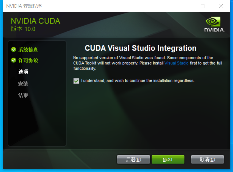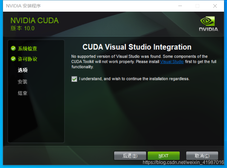 注意:这里的提示:以后如果需要下载Visual Stdio版本的要下载2017版的,不同电脑的配置也不同的,所以下载需要下载对应的版本