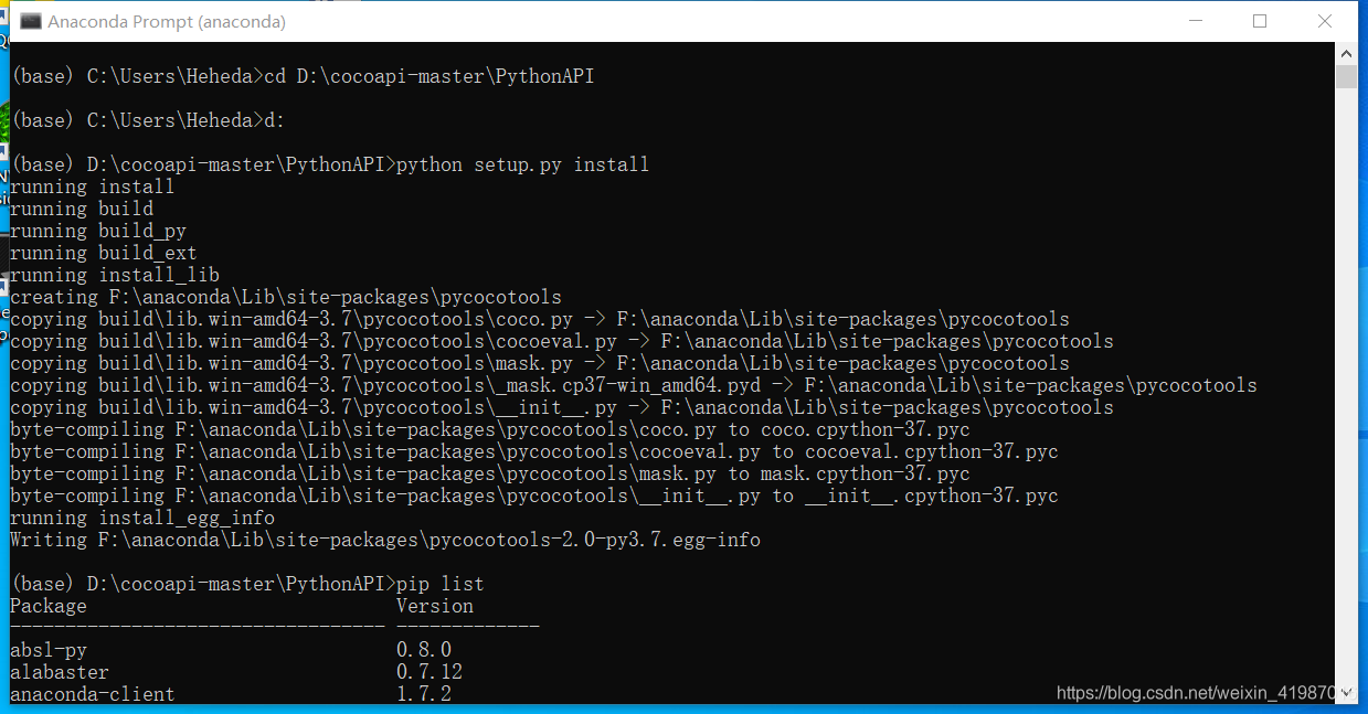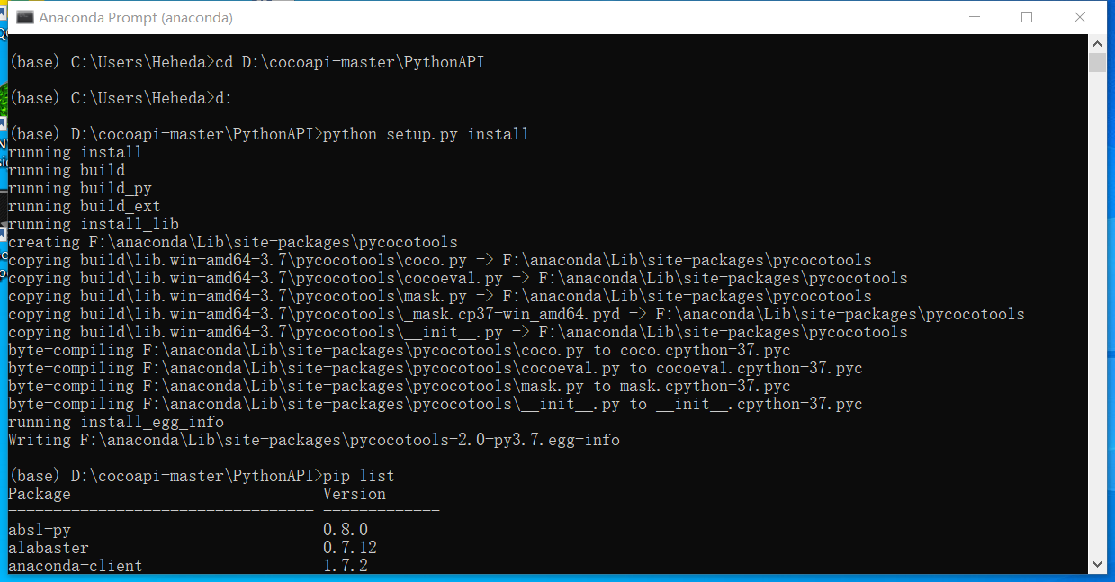 下载对应版本的visual stdio 2017版本,然后安装相应的组件,成功之后,进入coco目录,执行命令:python setup.py install,下图是成功的截图