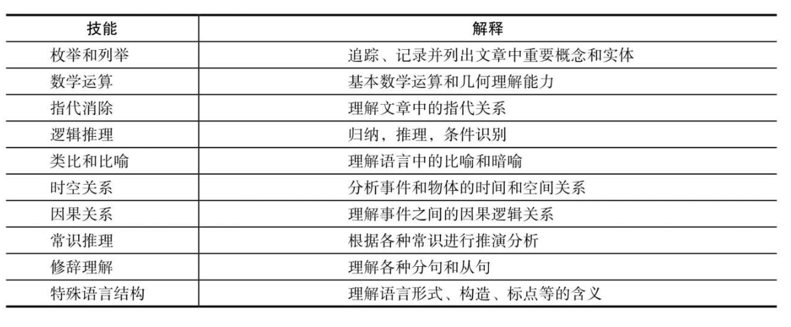 这些阅读理解技能涵盖了人类所掌握的阅读理解能力,即包括对语言和修辞等方面的理解,也包括对数学、常识等外部知识的掌握。
