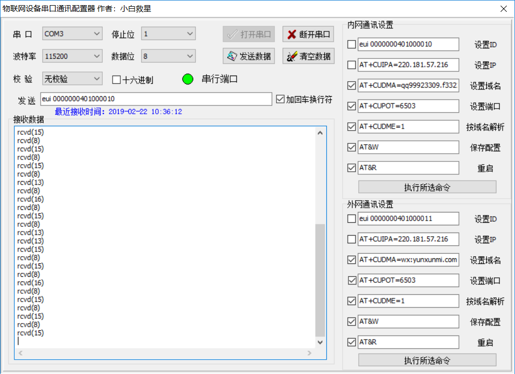 物联网硬件设备(COM)串口通讯配置器,适合串口开发串口调试,包括COM端口设备自动识别,自动接收输出硬件设备数据,可下发参数指令到硬件设备中,部分指令可自动保存,方便调试等日常工作。