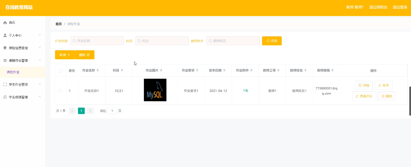 教师登录后,可以对课程作业进行添加修改删除操作。界面如下图所示:
