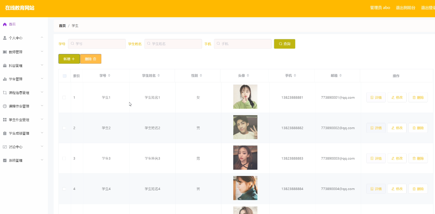基于SSM的在线教育网站的设计与实现的系统管理员可以管理员学生信息,可以对学生信息添加修改删除操作。具体界面的展示如图5.1所示。