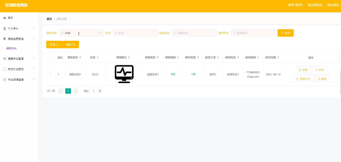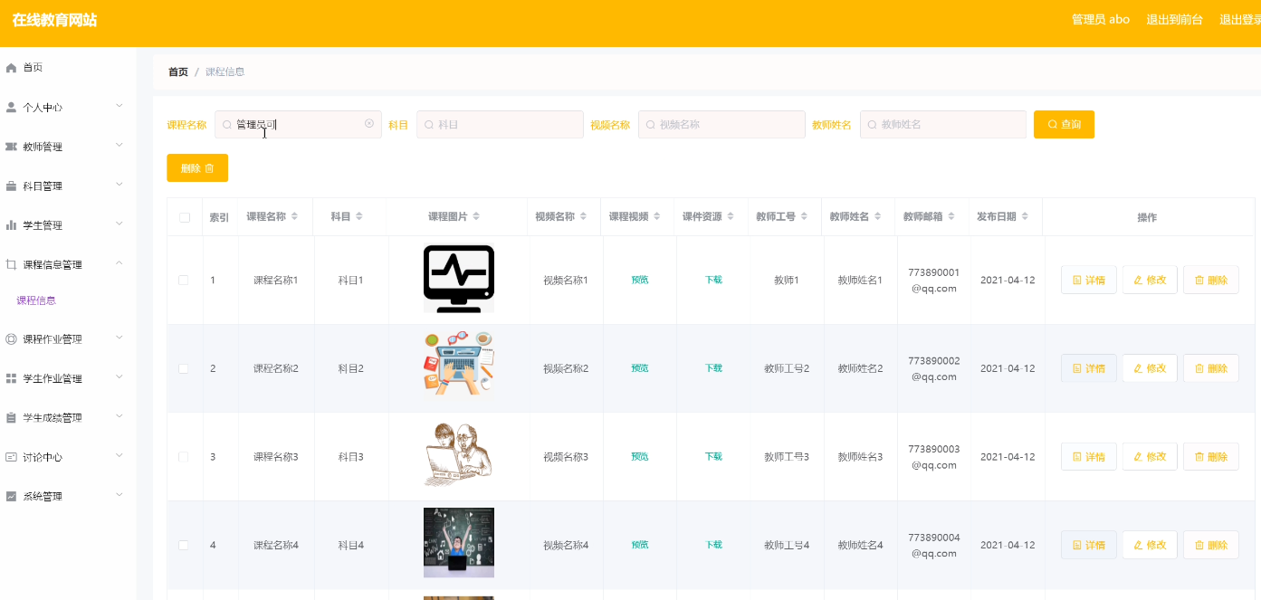 教师可以对课程信息进行添加,修改删除操作。界面如下图所示: