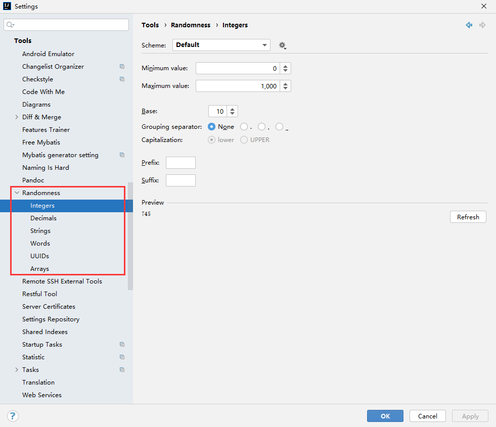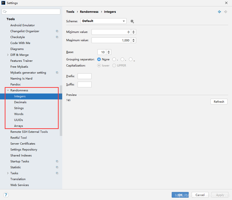 可以对要随机生成的数据进行一些设定限制,在File——>Settings——>Tools——>Randomness下可以对Integers、Decimals、Strings、Words、UUIDs和Arrays进行设置。