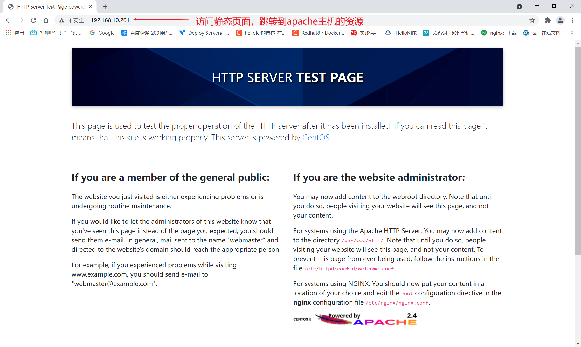 ##配置一下两段内容location / {proxy_pass http://static; ##访问静态资源找static}location ~ \.php$ {proxy_pass http://dynamic; ##访问动态资源找dynamic}#error_page 404 /404.html;[root@nginx ~]# nginx -s reload