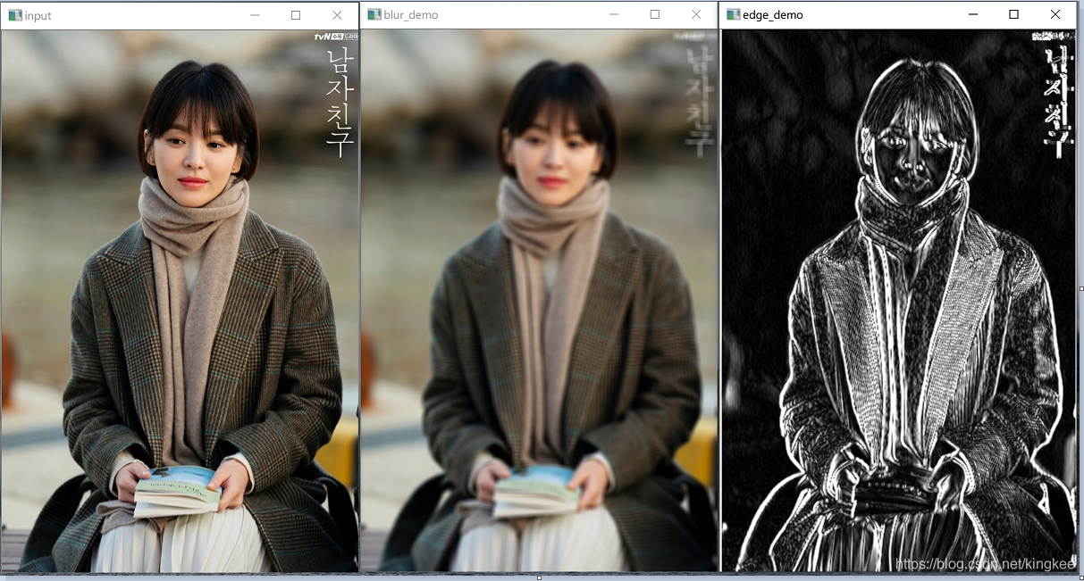 void edge_demo(Mat &image, Mat &sum) {int w = image.cols;int h = image.rows;Mat result = Mat::zeros(image.size(), CV_32SC3);int x2 = 0, y2 = 0;int x1 = 0, y1 = 0;int ksize = 3; // 算子大小,可以修改,越大边缘效应越明显int radius = ksize / 2;int ch = image.channels();int cx = 0, cy = 0;for (int row = 0; row < h + radius; row++) {y2 = (row + 1) > h ? h : (row + 1);y1 = (row - ksize) < 0 ? 0 : (row - ksize);for (int col = 0; col < w + radius; col++) {x2 = (col + 1) > w ? w : (col + 1);x1 = (col - ksize) < 0 ? 0 : (col - ksize);cx = (col - radius) < 0 ? 0 : col - radius;cy = (row - radius) < 0 ? 0 : row - radius;int num = (x2 - x1)*(y2 - y1);for (int i = 0; i < ch; i++) {// 积分图查找和表,计算卷积int s1 = getblockSum(sum, x1, y1, cx, y2, i);int s2 = getblockSum(sum, cx, y1, x2, y2, i);result.at(cy, cx)[i] = saturate_cast(s2 - s1);}}}Mat dst, gray;convertScaleAbs(result, dst);normalize(dst, dst, 0, 255, NORM_MINMAX);cvtColor(dst, gray, COLOR_BGR2GRAY);imshow("edge_demo", gray);
