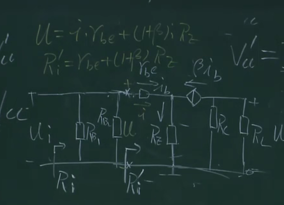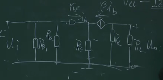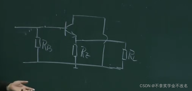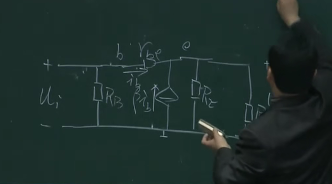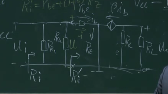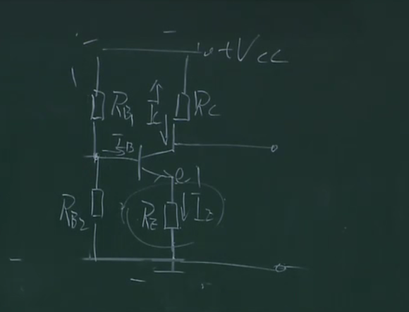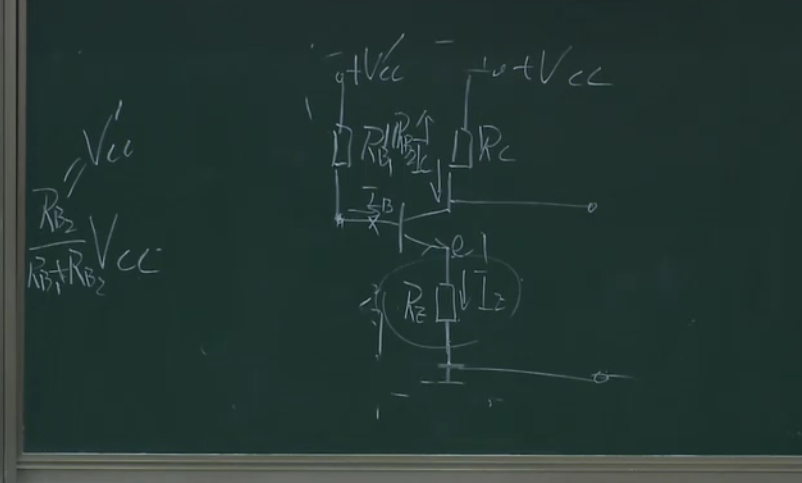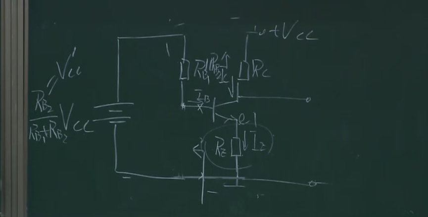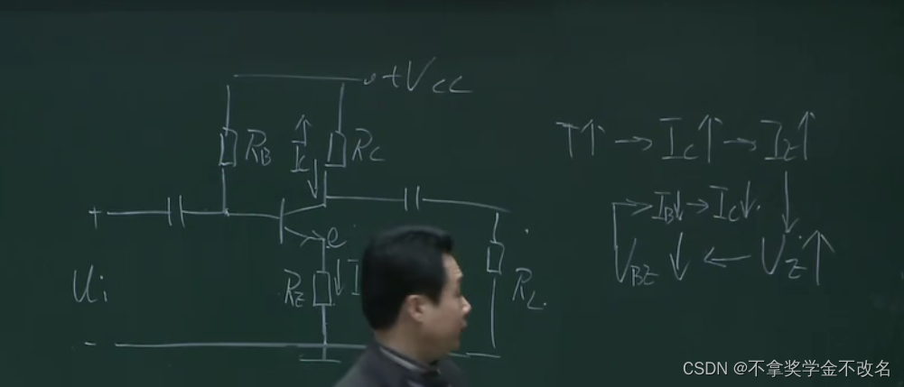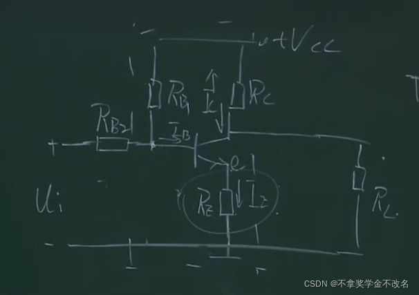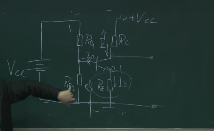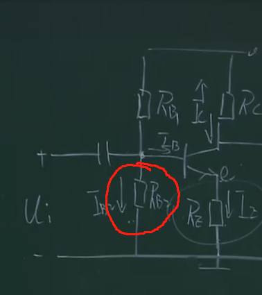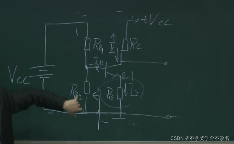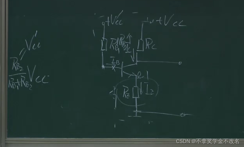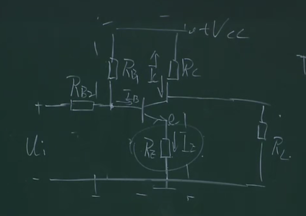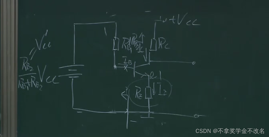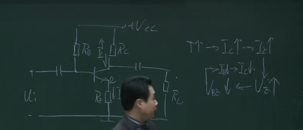 在这部分加一个电阻,且让这部分的电流远远大于基极的电流,这样的话ub的电压就相当于rb1和rb2的分压,相当于钳制住了ub,这样上面的分析,当ue增大的时候,因为ub不变则会导致ube减小,ib减小,ic减小,也就控制住了ic,本来ic能窜十步,这样只窜了一步,这里相当于一个负反馈