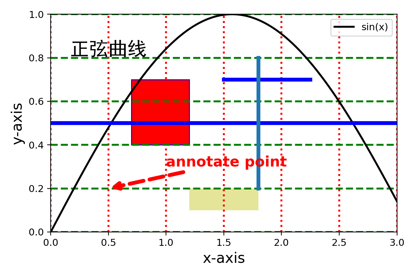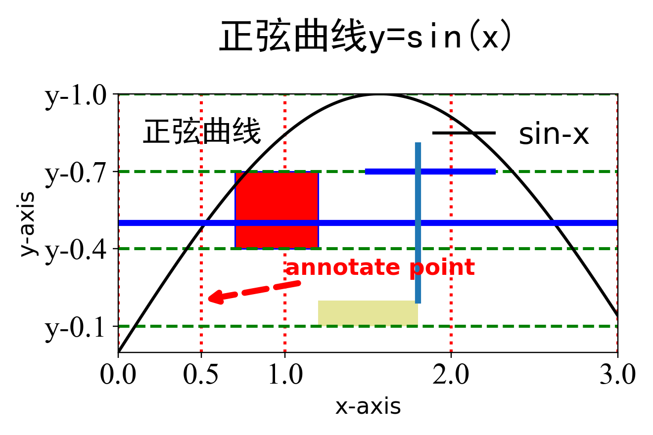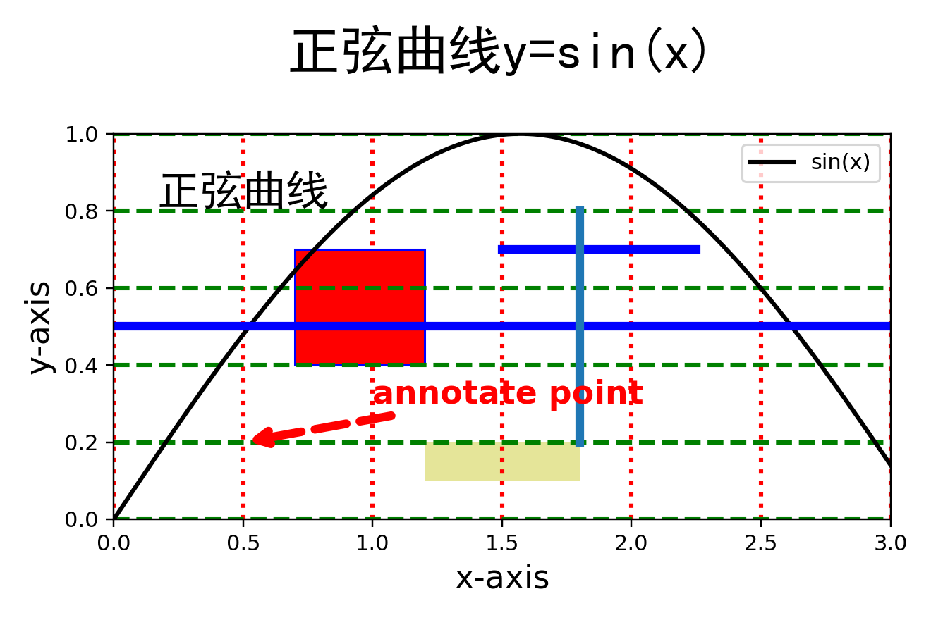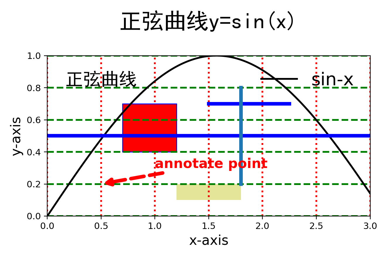 plt.text(x=0.5,y=0.8,s='正弦曲线',family='SimHei',size=20,va='bottom', # 垂直方向位置ha='center' # 水平方向位置)