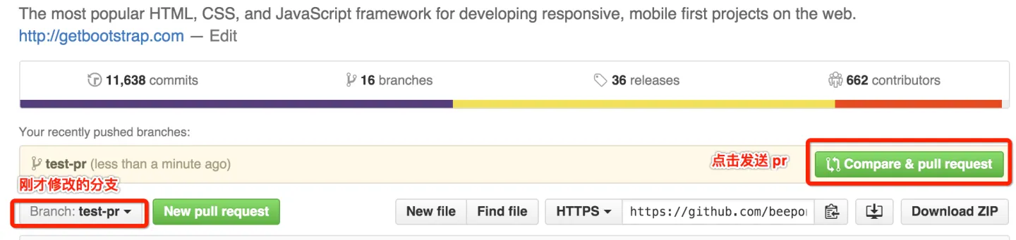 3. 完成修改之后,回到 test-pr 分支,点击旁边绿色的 Compare & pull request 按钮