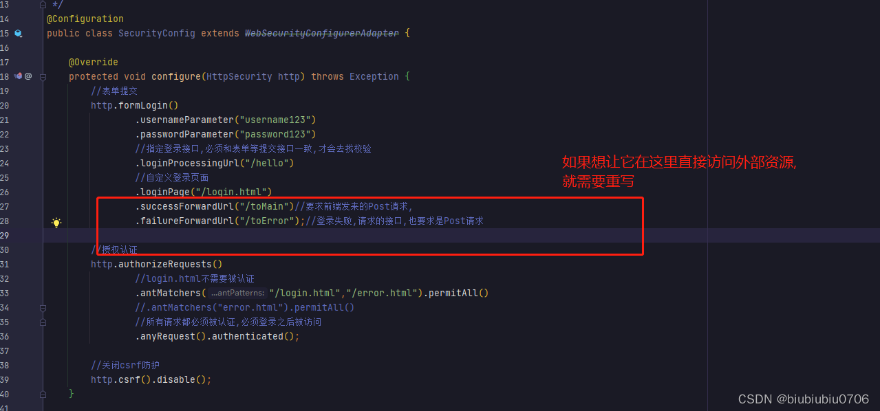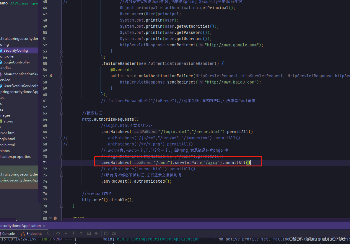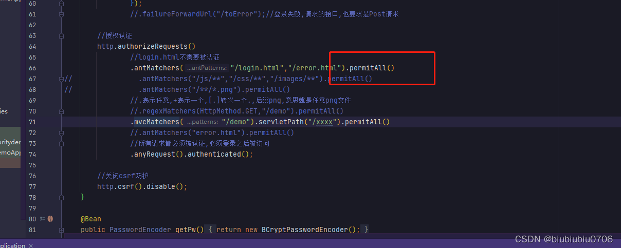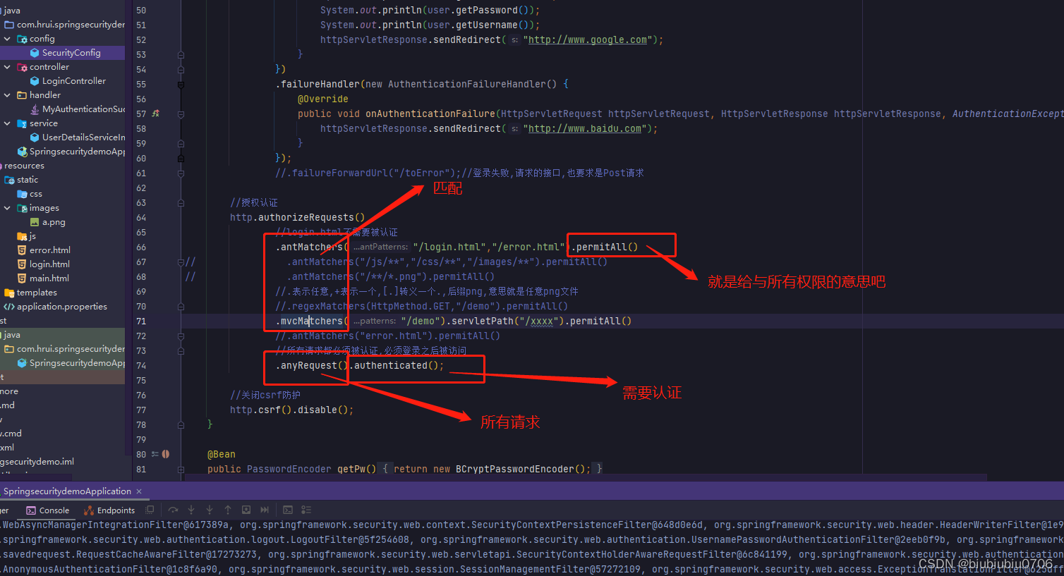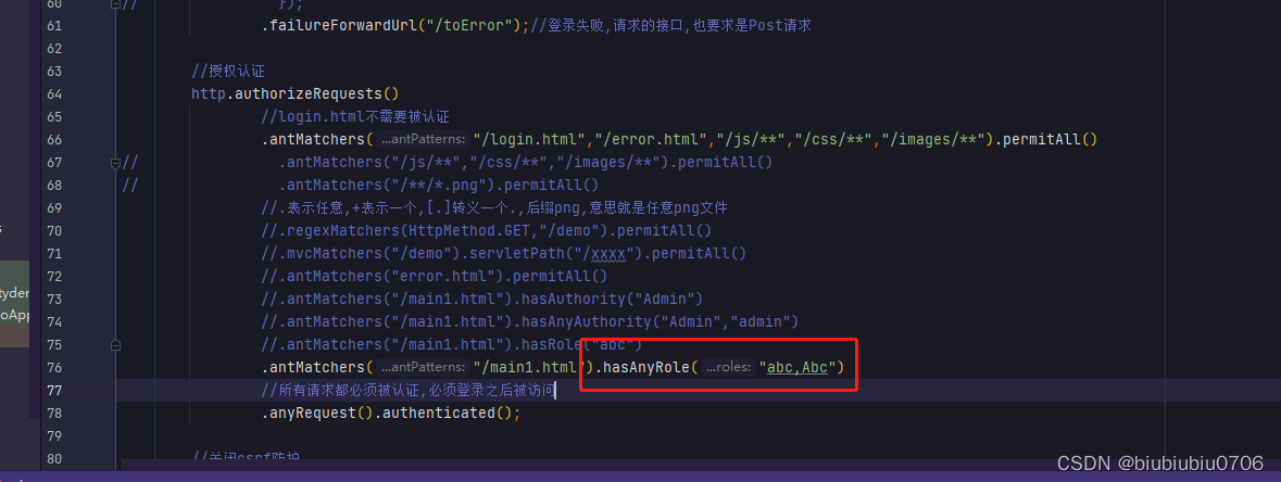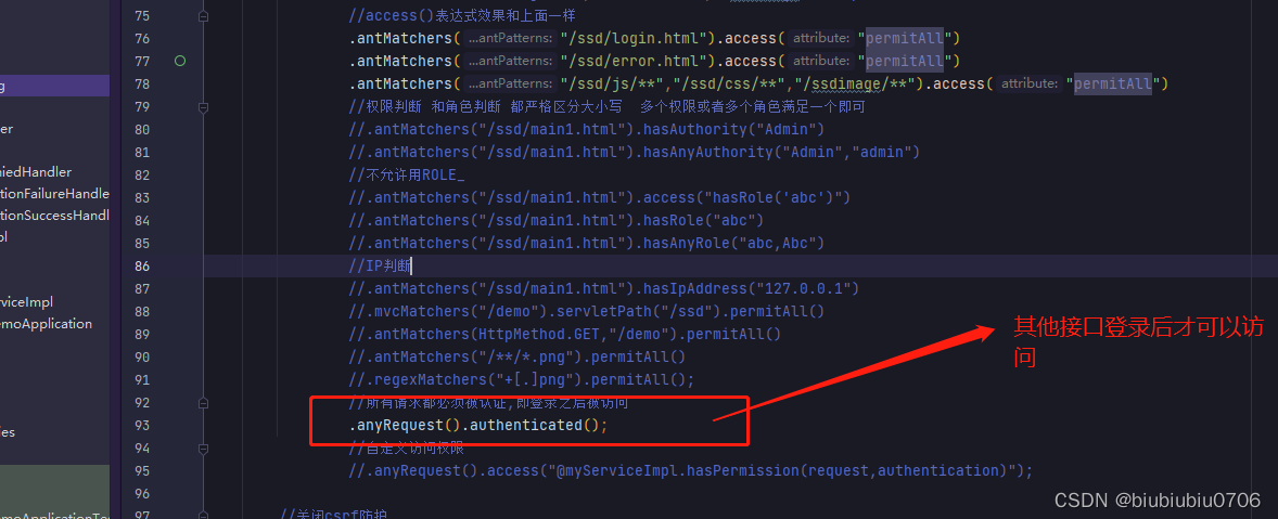上面anyRequest就是所有请求都需要做什么事 一般都是.anyRequest().authenticated().即都需要被认证,即登录后可以访问